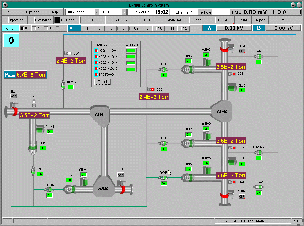 На снимках экранов систем управления циклотроном У-400 показаны следующие панели: